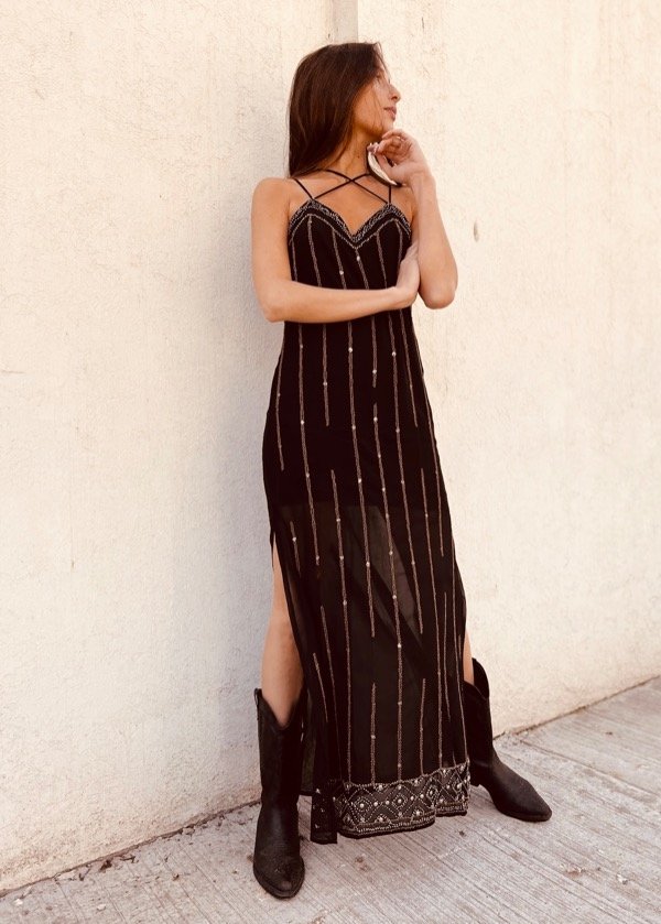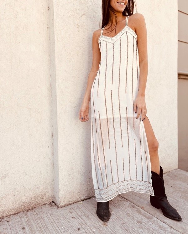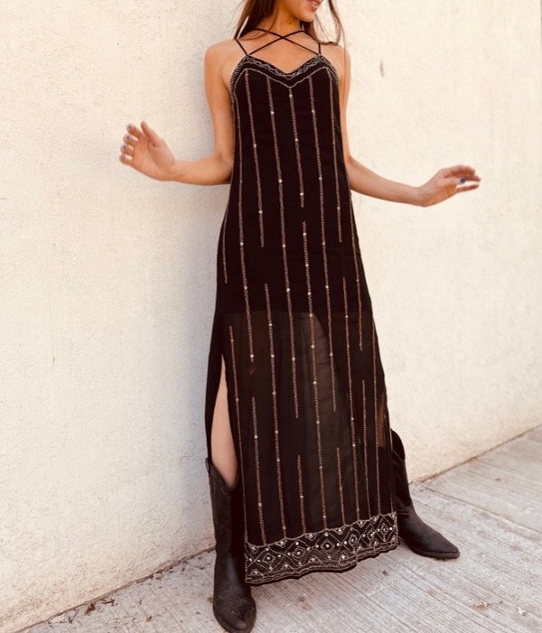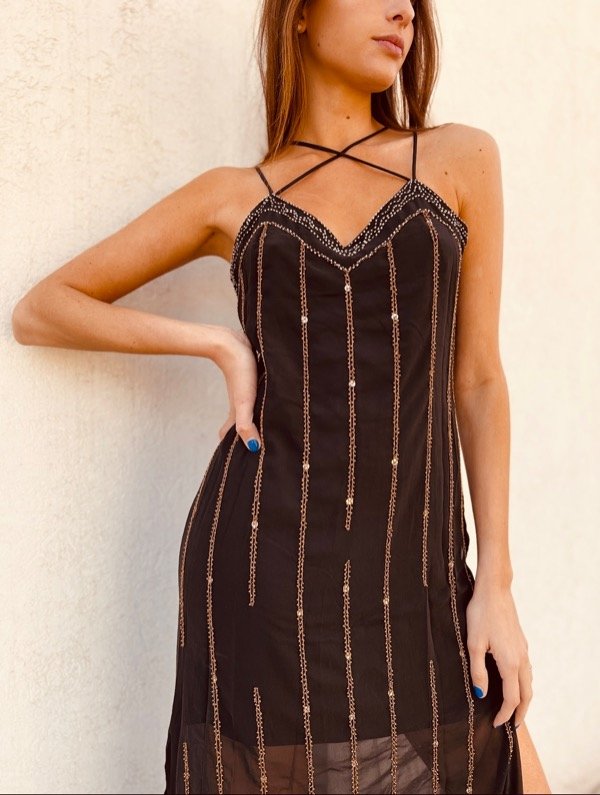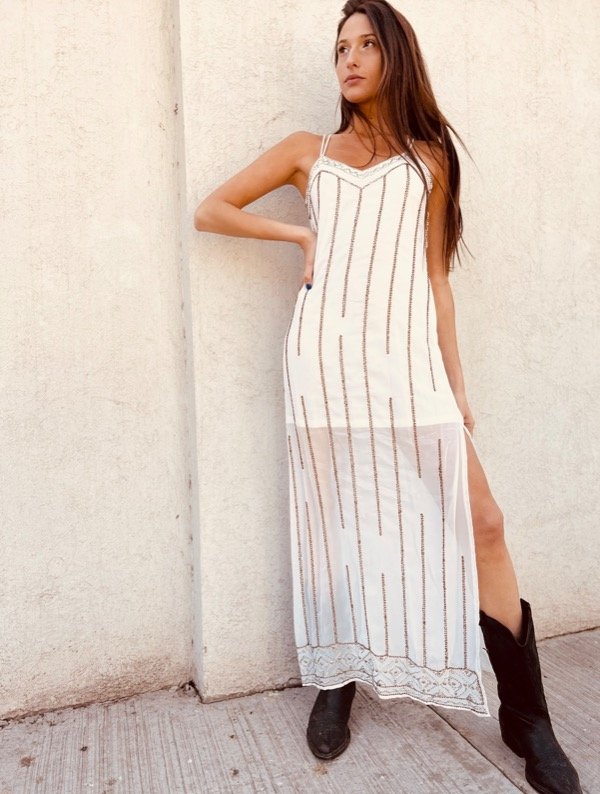 CONFECCIONADO: en gasa crepe, bordado NEGRO O BLANCO, forrado hasta donde comienza el tajo, con breteles con usos diferentes.