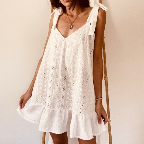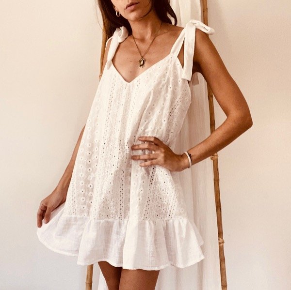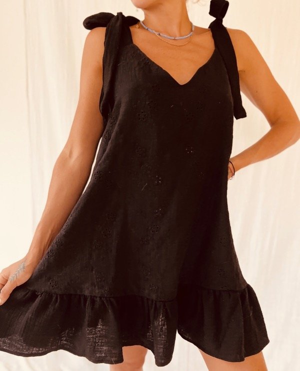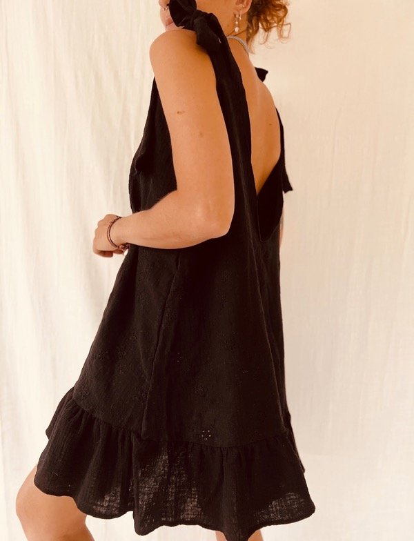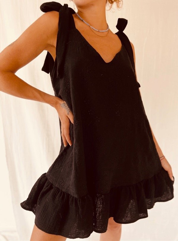 En algodón y broderie, color OFF WHITE o NEGRO. Con breteles para anudar y ajustar escote.