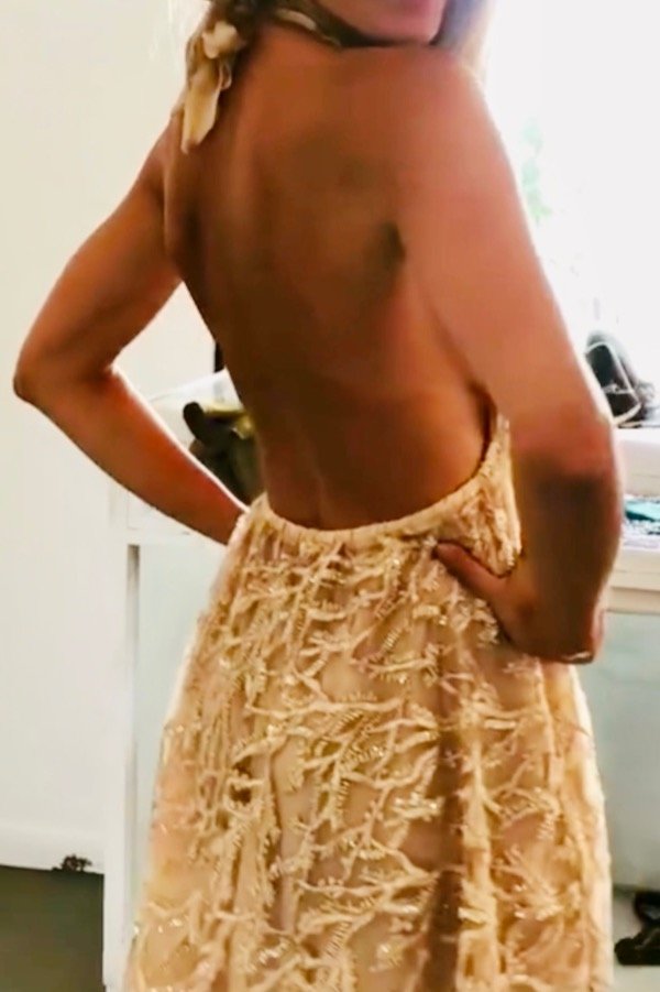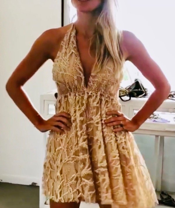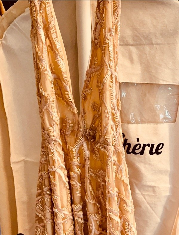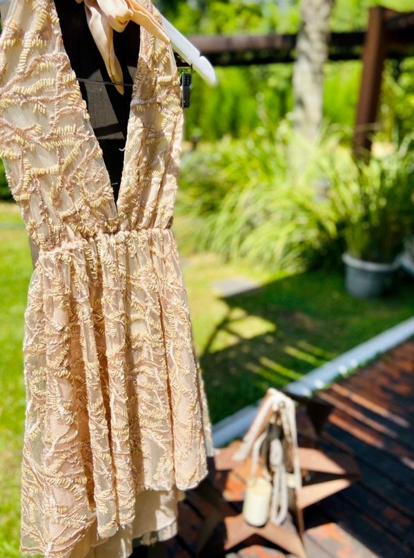 Vestido corte Marilyn, confeccionado en Tull con mostasillas y canutillos color Nude. Completamente bordado muy fiesta. TOP