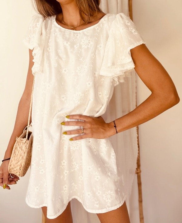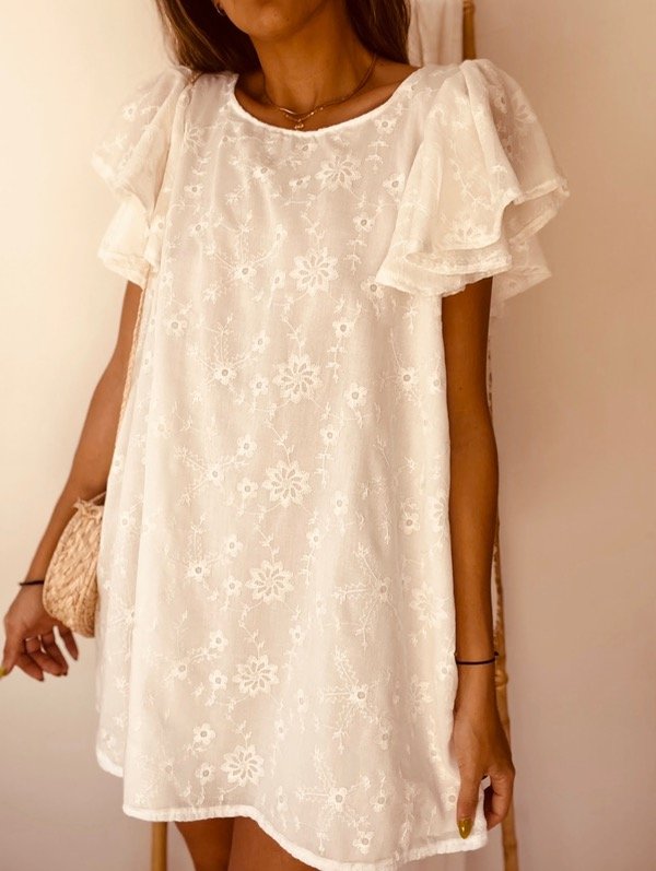 Vestido Manuela, confeccionado en algodón bordado, forrado, OFF WITHE