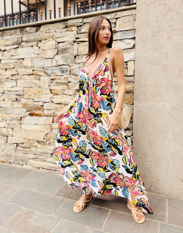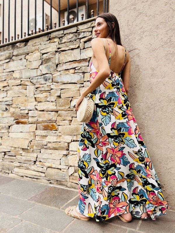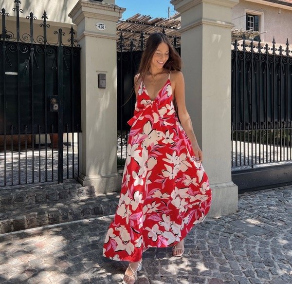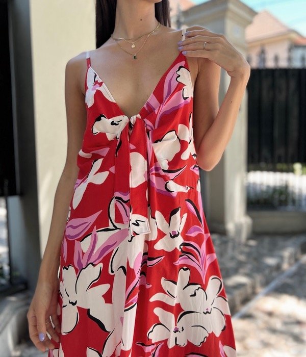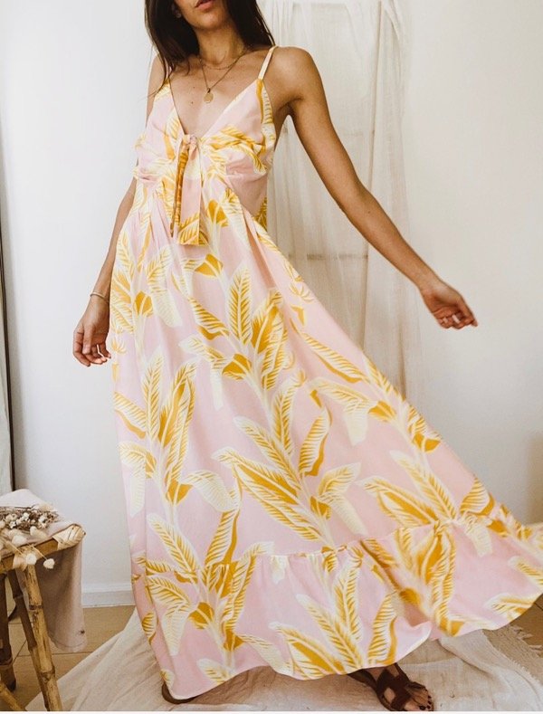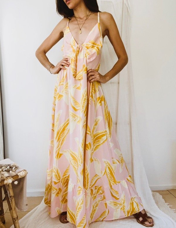Vestido SUNNY, confeccionado en heavy rayón estampado fondo rosa, y estampado rosa, naranja, con lazos en el busto, y elástico en la espalda.